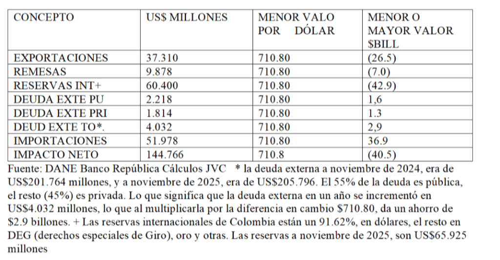 Medido el impacto del dólar sobre las anteriores variables, arroja como resultado una pérdida neta para el país de unos $40.5 billones de pesos, principalmente por la pérdida para el gobierno del valor en pesos de las reservas internacionales, como a los exportadores y a las familias que reciben remesas de sus familiares.