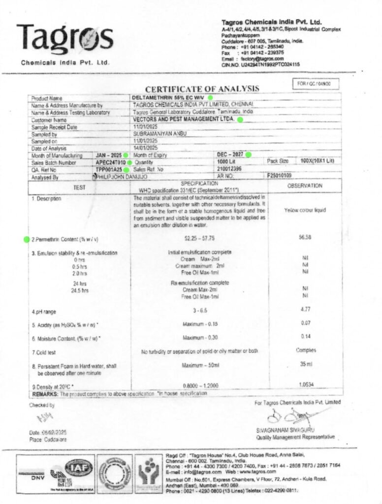 El veedor reveló en su denuncia que el certificado, emitido por Tagros Chemicals India Pvt. Ltd., tenía una contradicción química fatal: se titulaba DELTAMETHRIN, pero el cuerpo del análisis reportaba contenido de Permethrin.