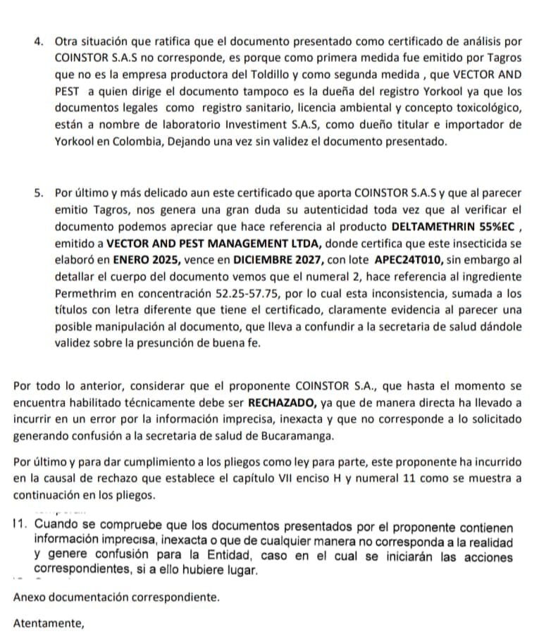 Pero tras revisar el contenido, el veedor descubrió que: El certificado no corresponde a un toldillo impregnado, sino a un insecticida líquido industrial, l análisis interno menciona Permethrin (Permetrina), un ingrediente activo distinto al del encabezado (Deltamethrin), el documento fue dirigido a Vector and Pest Management, no a COINSTOR, y no fue expedido por el fabricante real del toldillo. por otro lado la fecha del documento es de 2019, es decir, cuatro años antes del proceso contractual.