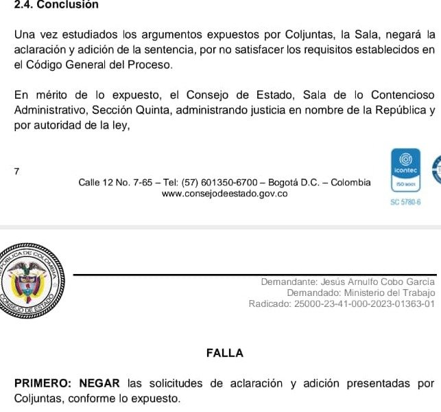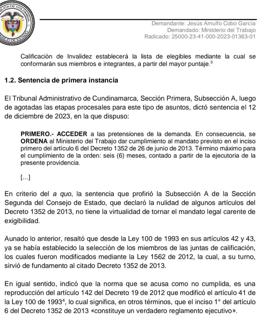 El abogado Jesús Cobo interpuso la acción de cumplimiento para exigir que el Ministerio del Trabajo aplicara una norma que durante más de una década permaneció sin ejecución. La alta corte determinó que, aunque algunos artículos del Decreto 1352 fueron anulados en 2021, el inciso primero del artículo 6 sigue vigente y, por tanto, la obligación de convocar el concurso no desaparece.