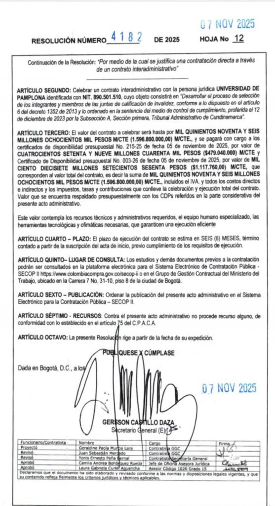 Finalmente, Coljuntas hizo un llamado a la Oficina de Contratación del Ministerio del Trabajo y a los organismos de control para que revisen la legalidad del proceso MT-SI-026-2025, el cual, según la organización presenta irregularidades evidentes.