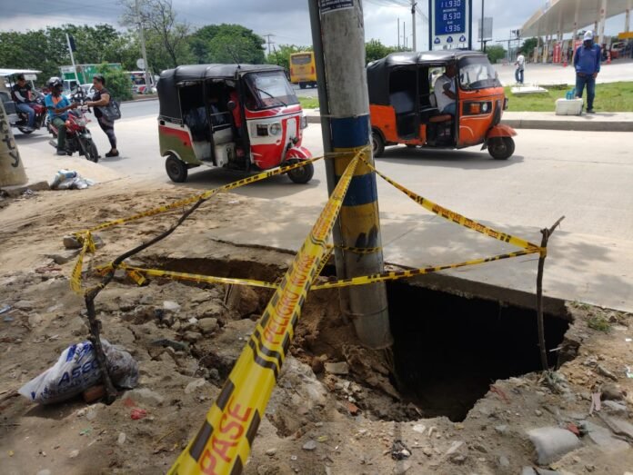 Atención nuevamente cráter en andén carrera 16 con calle 30 vía aeropuerto (barrio San Antonio) en Soledad está socavando el pavimento y pone en peligro a peatones y conductores de vehículos.